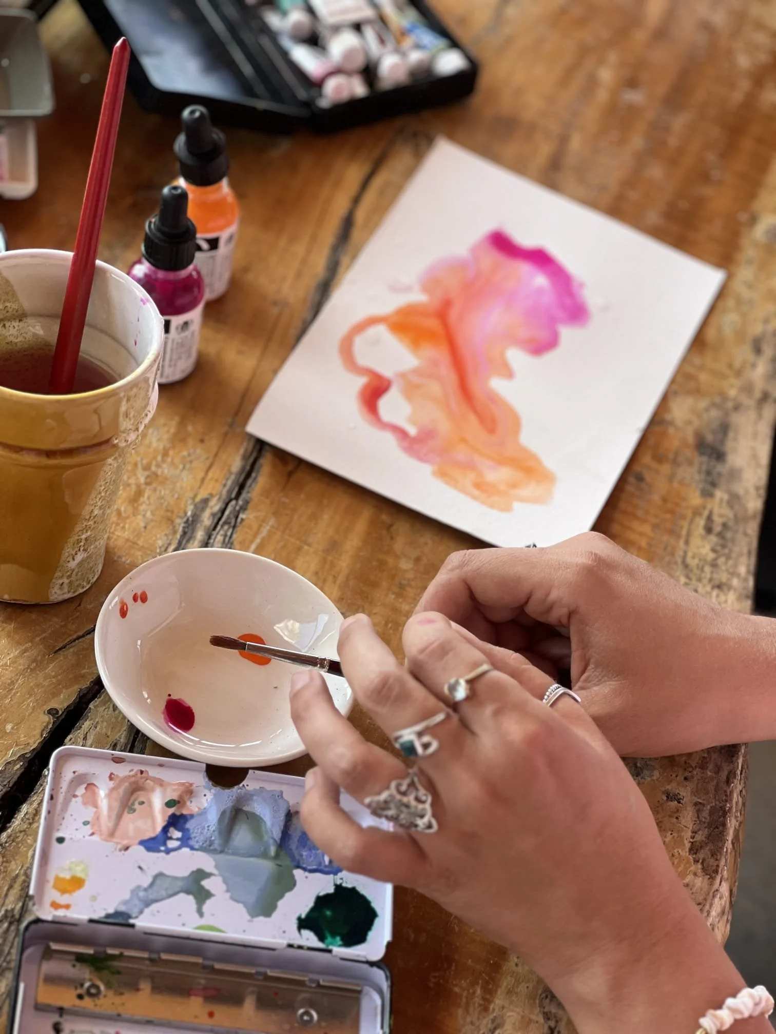 During the workshop, I will introduce you different materials and share basic techniques. Here to guide you if you have questions or want support in achieving a specific result, my primary objective is to help you enter a state of creative flow and enjoy a moment for yourself.